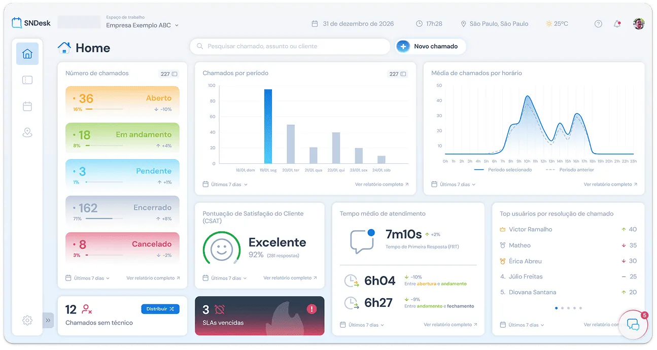 No SNDesk, dashboards e SLAs mostram gargalos e prioridades em tempo real, guiando decisões por fatos.